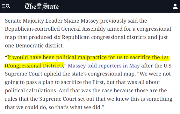 Or consider this statement from the Senate Majority Leader, who told reporters it would have been “political malpractice” not to protect District 1 as a Republican seat: