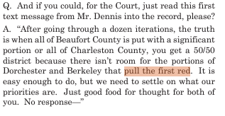Here’s Rep. Jay Jordan (R-Florence), at the October 2022 bench trial in our previous case Alexander v. SC NAACP, admitting that he aimed to “pull the first” (that is, the First Congressional District) “red” (that is, safe for Republican candidates).